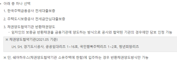 - 임차 전용면적 85m2이하 주택 및 채권양도협약기관 소유의 기숙사(호수가 구분되어 있고 전입신고가 가능한 경우)