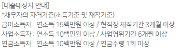 - 채무자의 자격기준(소득기준 및 재직기준)을 만족하는 분