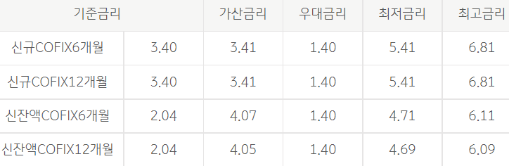 대출금리는 구분금리에 따라 아래와 같이 달라집니다.