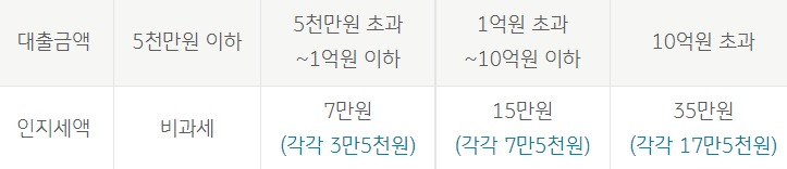 인지세란 대출거래 신규 약정 시 내는 세금으로 대출금액에 따라 아래와 같이 인지세는 차등 적용되며 발생한 인지세는 은행과 고객이 각각 50%씩 부담하게 됩니다.