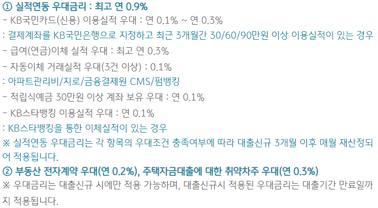 기준금리 + 가산금리 - 우대금리를 최종 적용하며 우대금리 조건은 아래와 같습니다.