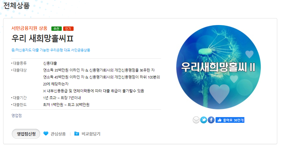 우리은행 새희망홀씨 II는 중 저신용자도 대출 가능한 우리은행 대표적인 서민금융상품이며 서민금융을 위해서 신용대출 상품입니다. 대출 대상은 연소득 35백만 원 이하인 자와 신용평가회사의 개인신용평점을 보유한 자이거나