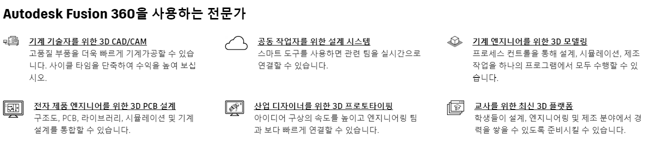 1. [오토데스크 Fusion360 공식 홈페이지](https://www.autodesk.com/products/fusion-360/overview)에 접속합니다.