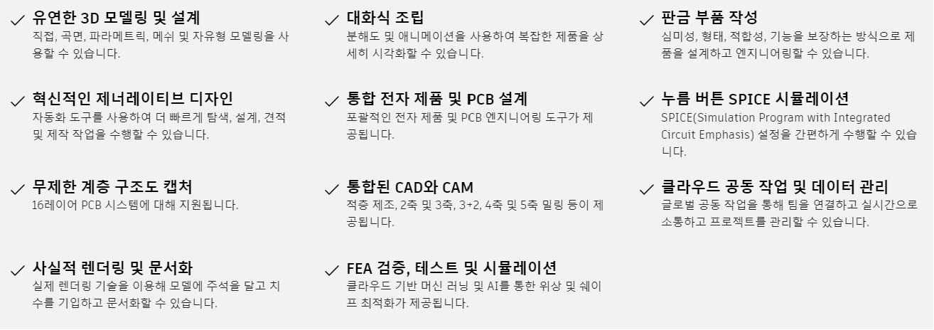 - 통합된 디자인 환경: 오토데스크 Fusion360은 3D 모델링 뿐만 아니라 시뮬레이션, 렌더링, CAM, PCB 디자인 등의 기능을 하나의 프로그램에서 제공합니다. 사용자는 별도의 소프트웨어를 설치하거나 전환할 필요 없이 원하는 작업을 수행할 수 있습니다.