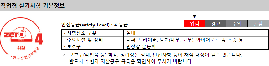 실기시험의 경우 안전등급 4등급의 시험으로 꼭 보호구 및 수험생 지참공구 목록을 확인하여 챙기셔야 감점을 당하지 않습니다.
