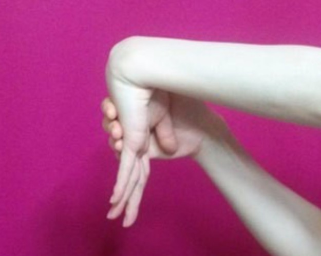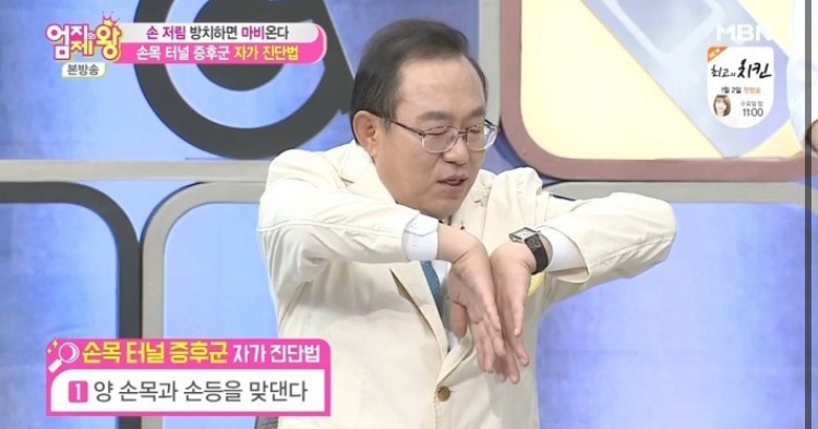 양 손의 손들을 맞댄 상태에서 손목을 90도로 꺾인 모습으로 약60초간 자세를 유지한 후 손목 부근에 통증이 있다면