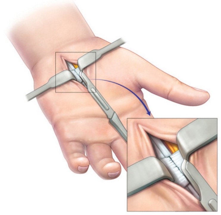수술적 치료로는 손목과 가까운 손바닥을 절개한 다음 정중신경을 싸고 있는 인대를 잘라줍니다.