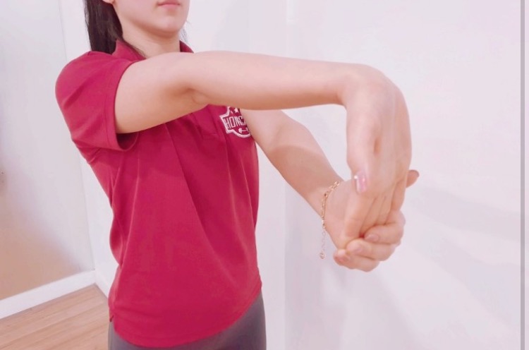 2.반대쪽 손으로 편 손을 살짝 구부려 바깥쪽으로 향하게 10초간 유지해주세요.