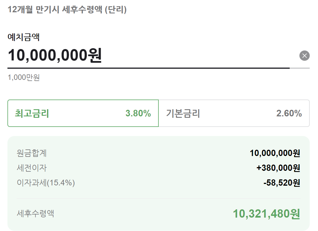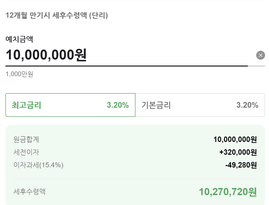 이 상품 1천만원 가입 12개월 만기 시 예상 세후 수령액은 아래와 같습니다.