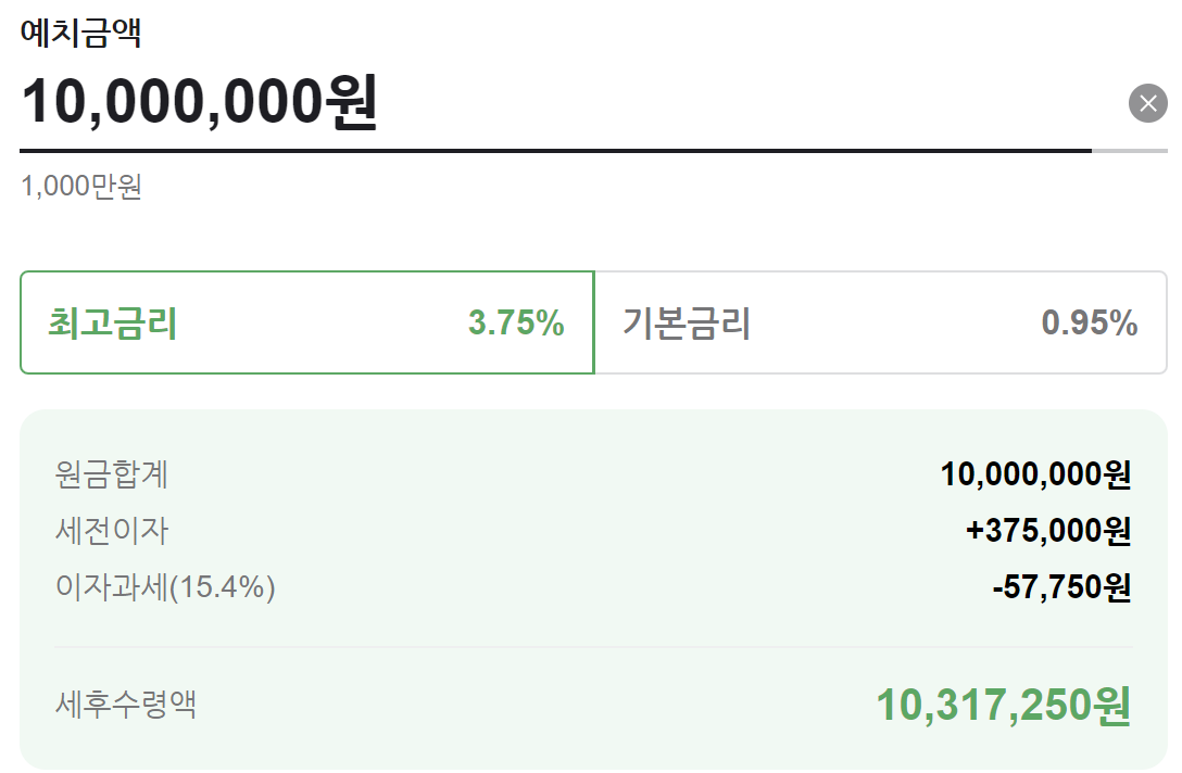 가입대상은 개인 및 개인사업자로 1천만원 예금 12개월 가입 시 이자소득세인 15.4%를 제외한 예상 수령액은 아래와 같습니다.