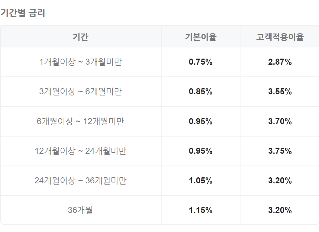 가입기간은 1개월 이상 36개월 이하로 만기일은 월단위로 지정이 가능하며 가입기간 별 금리는 아래와 같습니다.